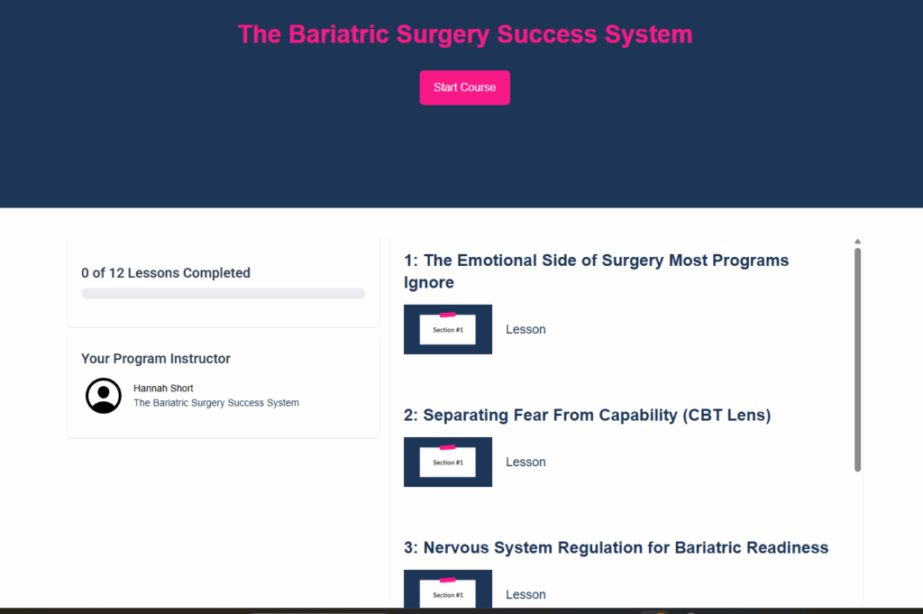 That’s why I created The Bariatric Surgery Success System — a trauma‑informed, psychologically grounded program designed to help women feel emotionally prepared before surgery and supported after.